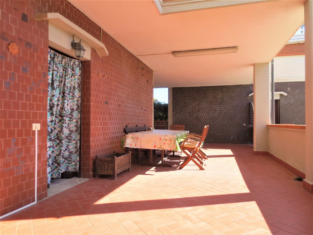 Ma ciò che rende davvero unico questo appartamento sono i suoi generosi spazi esterni: un ampio terrazzo circonda praticamente l’intero appartamento. E’ arredato con un tavolo e sedie, comode poltrone per rilassarsi e lettini prendisole per godersi il sole oltre ad una doccia esterna per rinfrescarsi al ritorno dalla spiaggia. Parte del terrazzo è coperta, offrendo la possibilità di pranzare all’ombra in totale comodità.