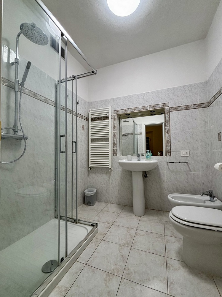 La zona notte include una grande camera matrimoniale con un spazioso guardaroba e un terrazzo privato, una camera doppia con un ingegnoso armadio a muro e due bagni completi, entrambi serviti da ampie e comode docce. L’appartamento è stato ristrutturato di recente utilizzando materiali di qualità. Sebbene manchi di condizionatori, è ben ventilato grazie alle numerose aperture.