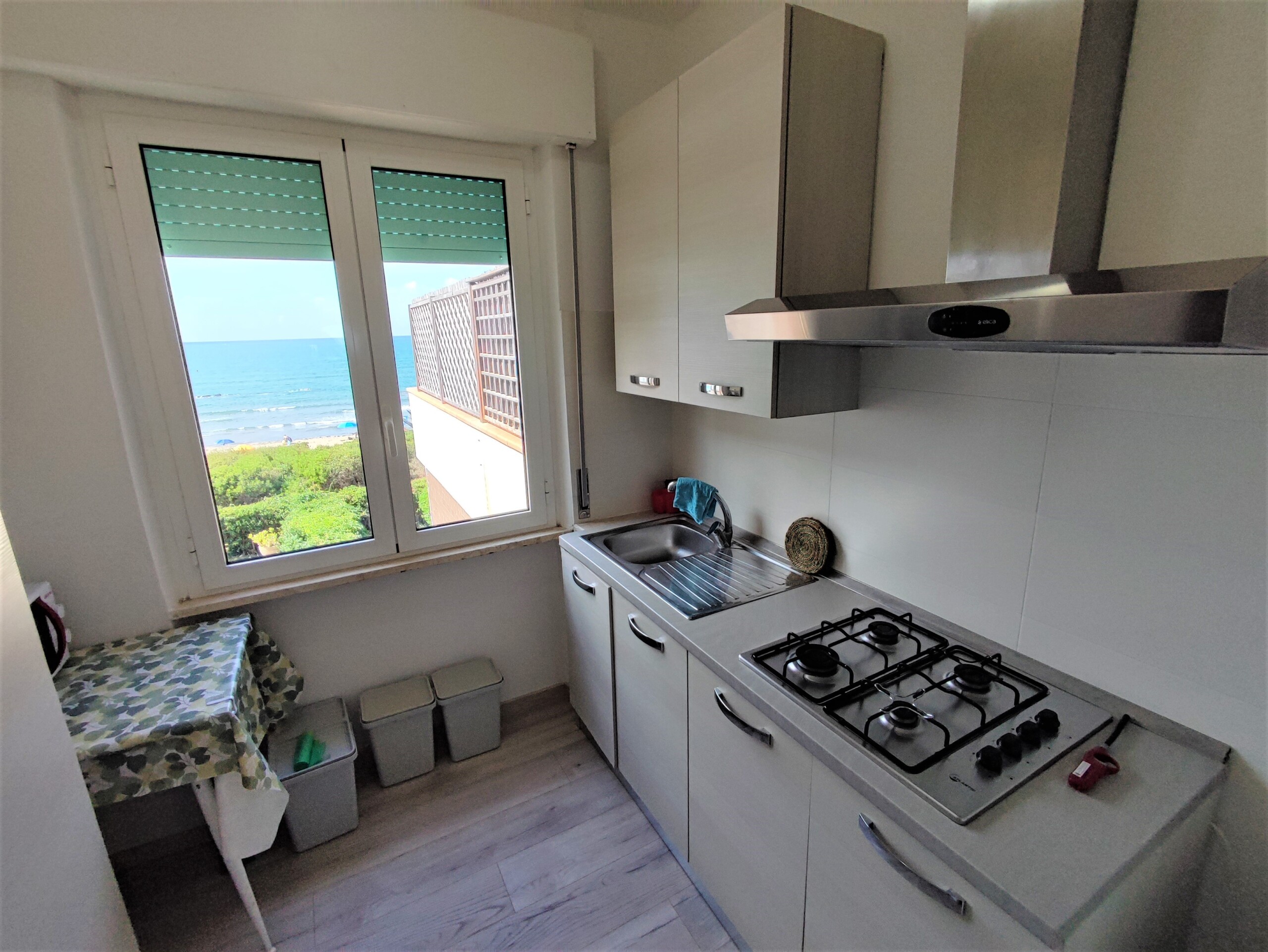 Incantevole appartamento fronte mare con ampio terrazzo parzialmente coperto da una tettoia di legno, ideale per pranzi all’ombra e momenti di relax. Situato al secondo ed ultimo piano di un complesso condominiale, questo appartamento offre accesso diretto al mare dalla corte condominiale.